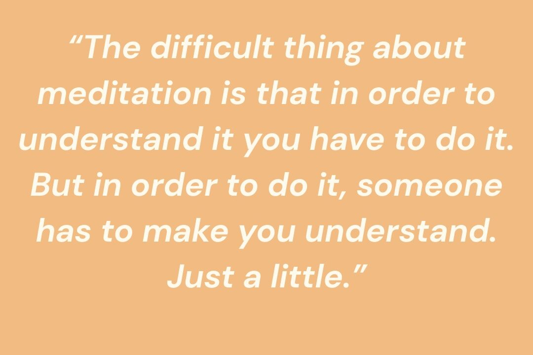 The difficult thing about meditation is that in order to understand it you have to do it. But in order to do it, someone has to make you understand. Just a little. So you have somewhere to start. Going to a yoga class helped. Seeking advice from teachers helped. Reading about it, sure. But mostly: doing it.